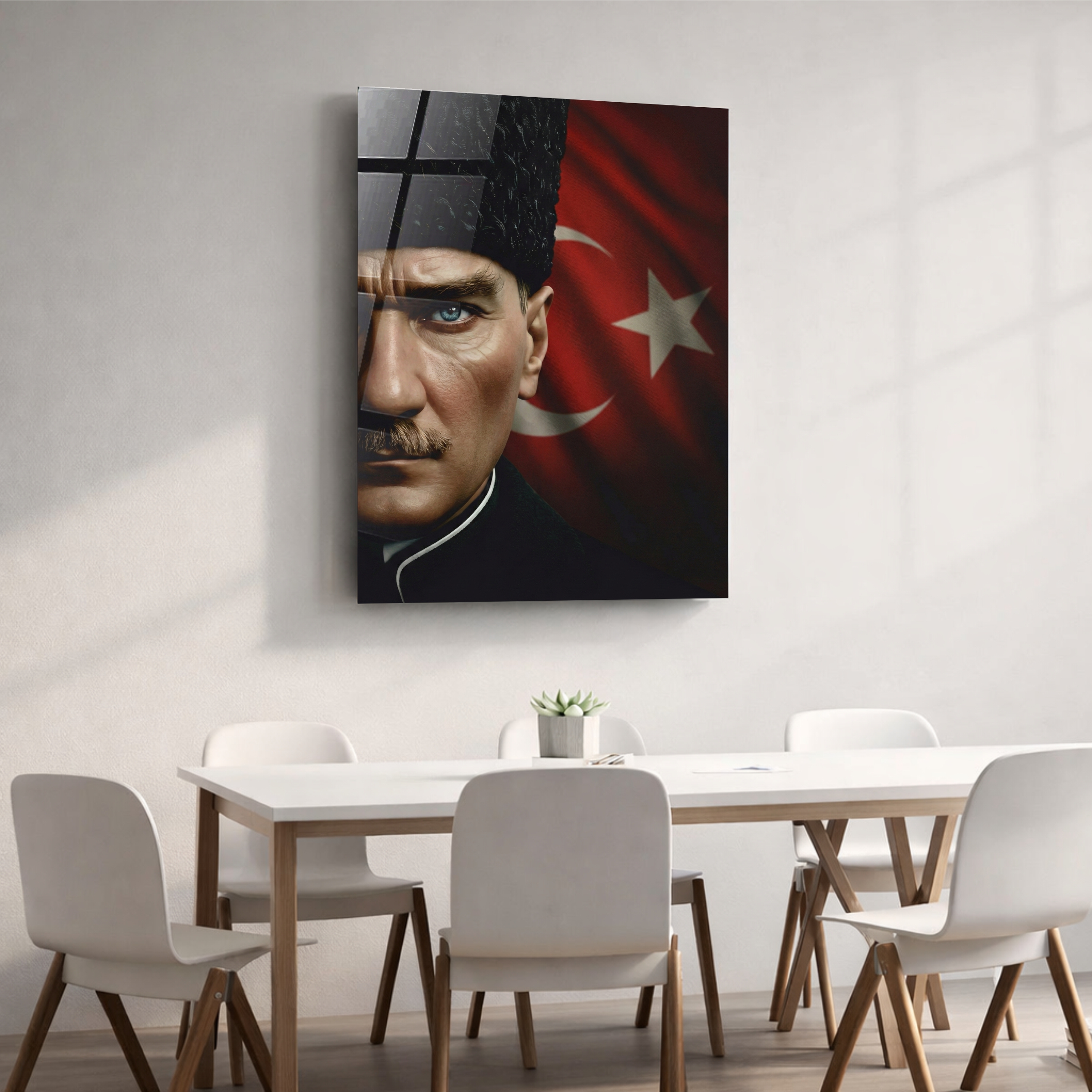 4 mm temperli cam üzerine UV baskılı Atatürk cam tablo. Şık ve modern duvar dekorasyonu.