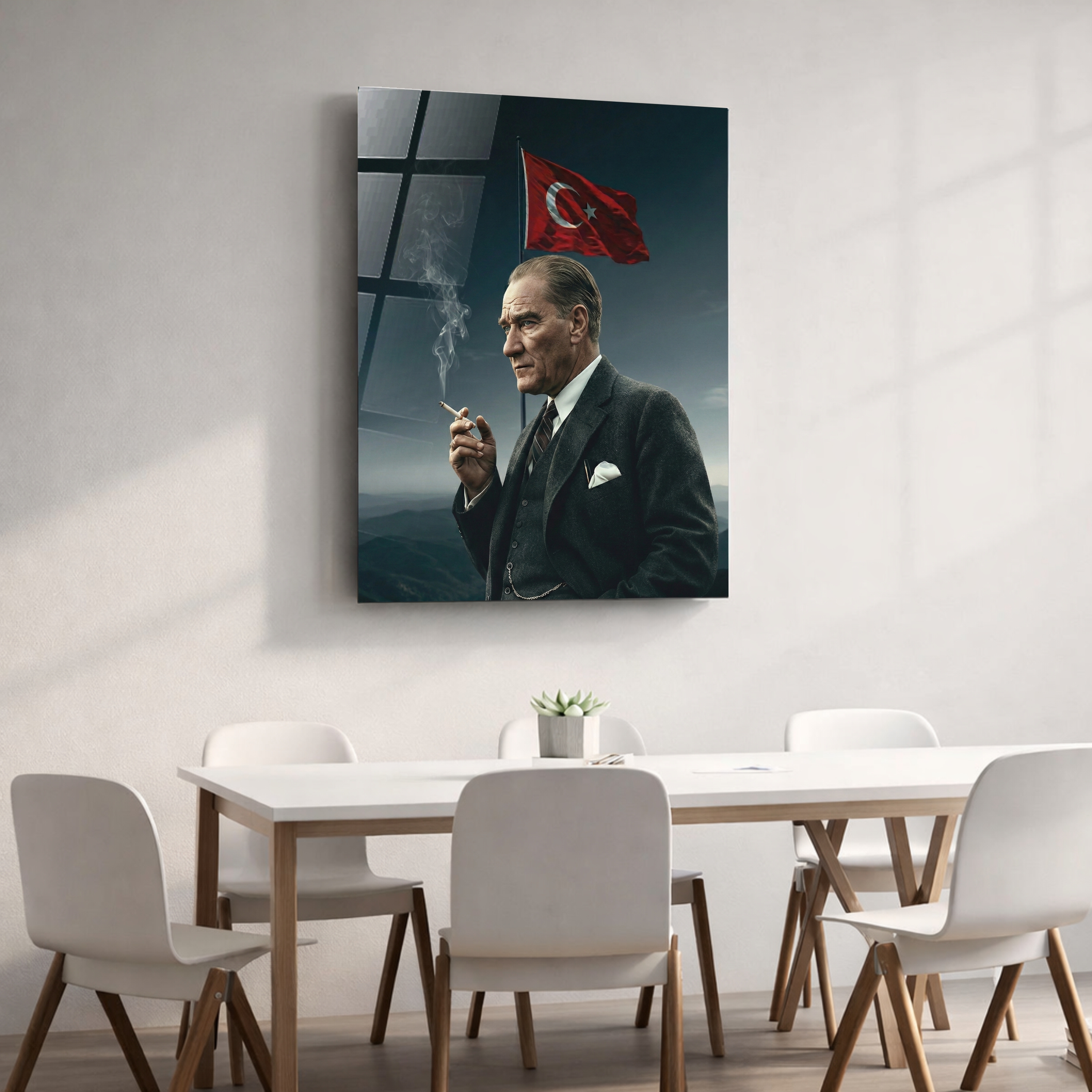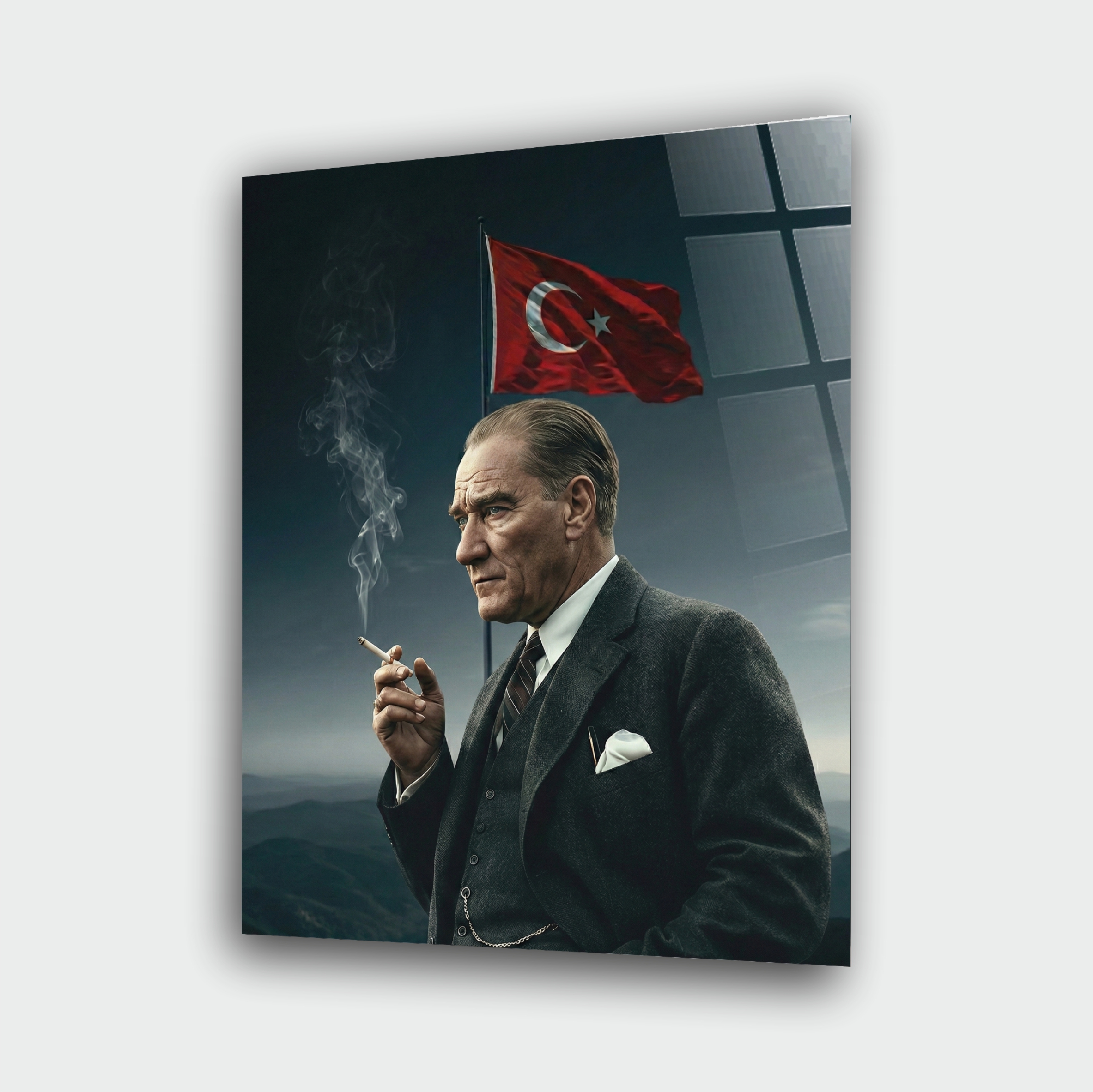 4 mm temperli cam üzerine UV baskılı Atatürk cam tablo. Şık ve modern duvar dekorasyonu.